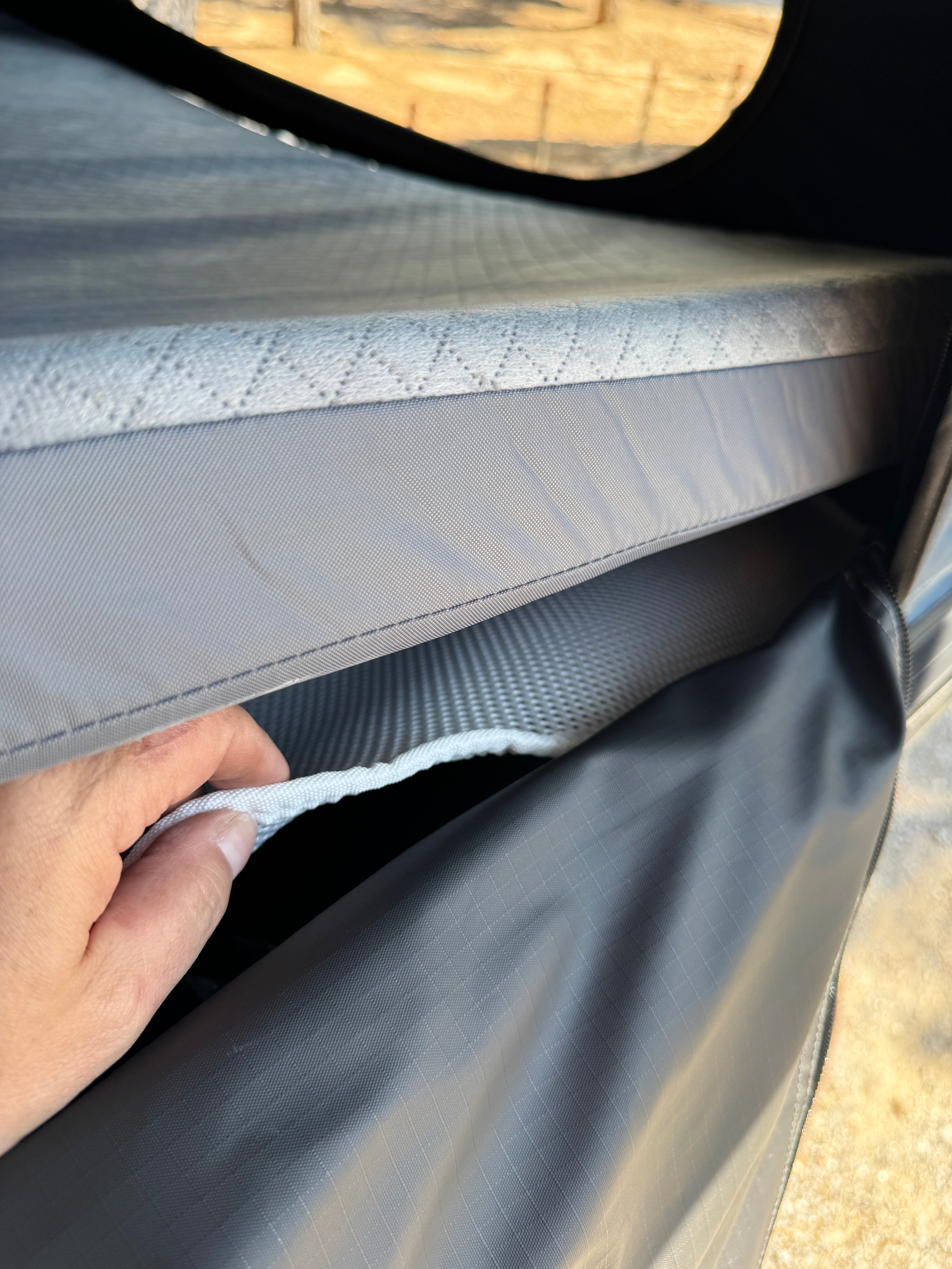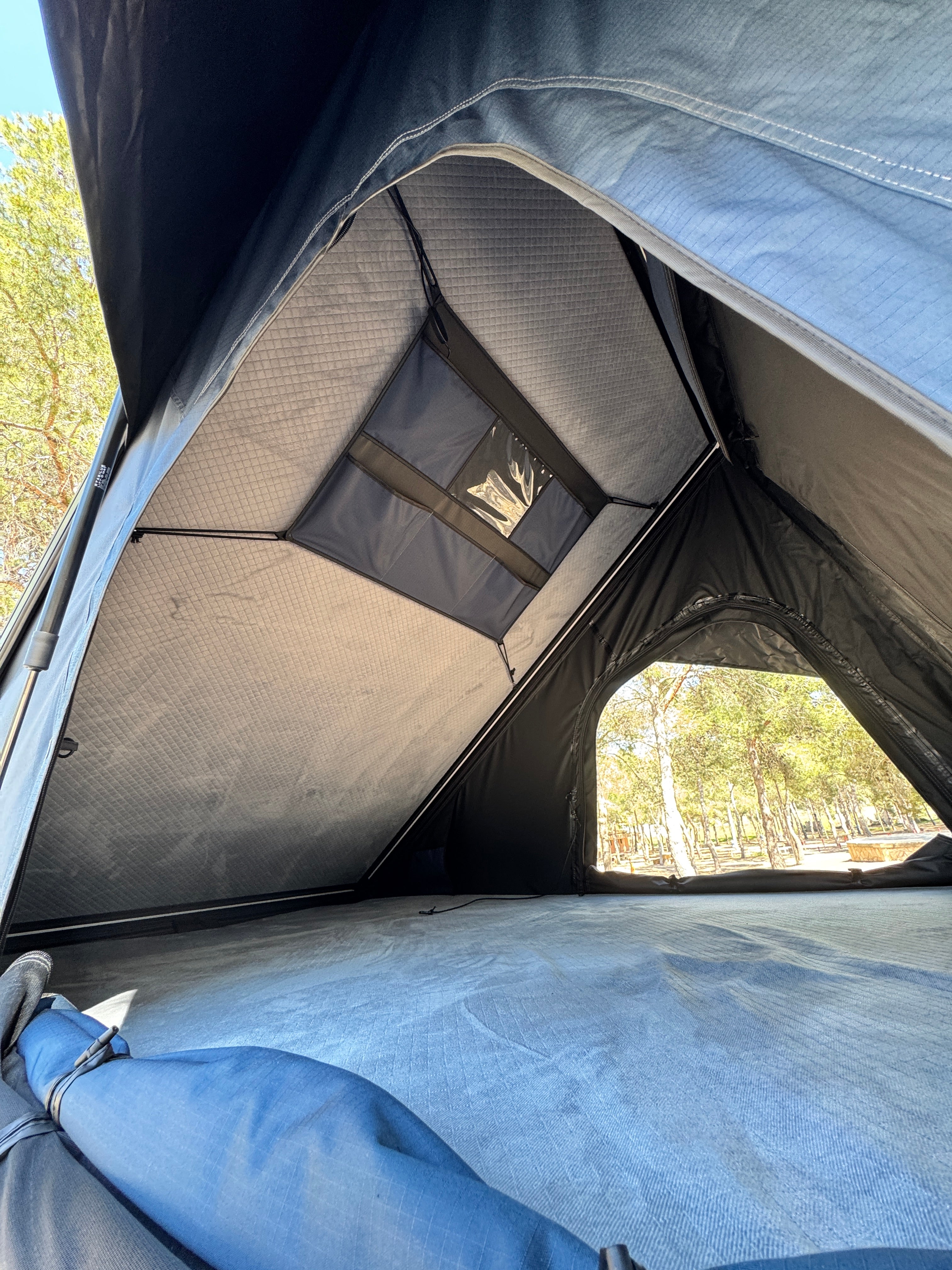 La tienda tiene una visión 360º y un colchón viscoelástico de 137x220x7 cm, ofreciendo una excelente comodidad y funcionalidad. Con su diseño compacto y aerodinámico, mejora la conducción y reduce la resistencia al viento, lo que la convierte en la opción ideal para viajeros, rutas overland y escapadas de fin de semana.