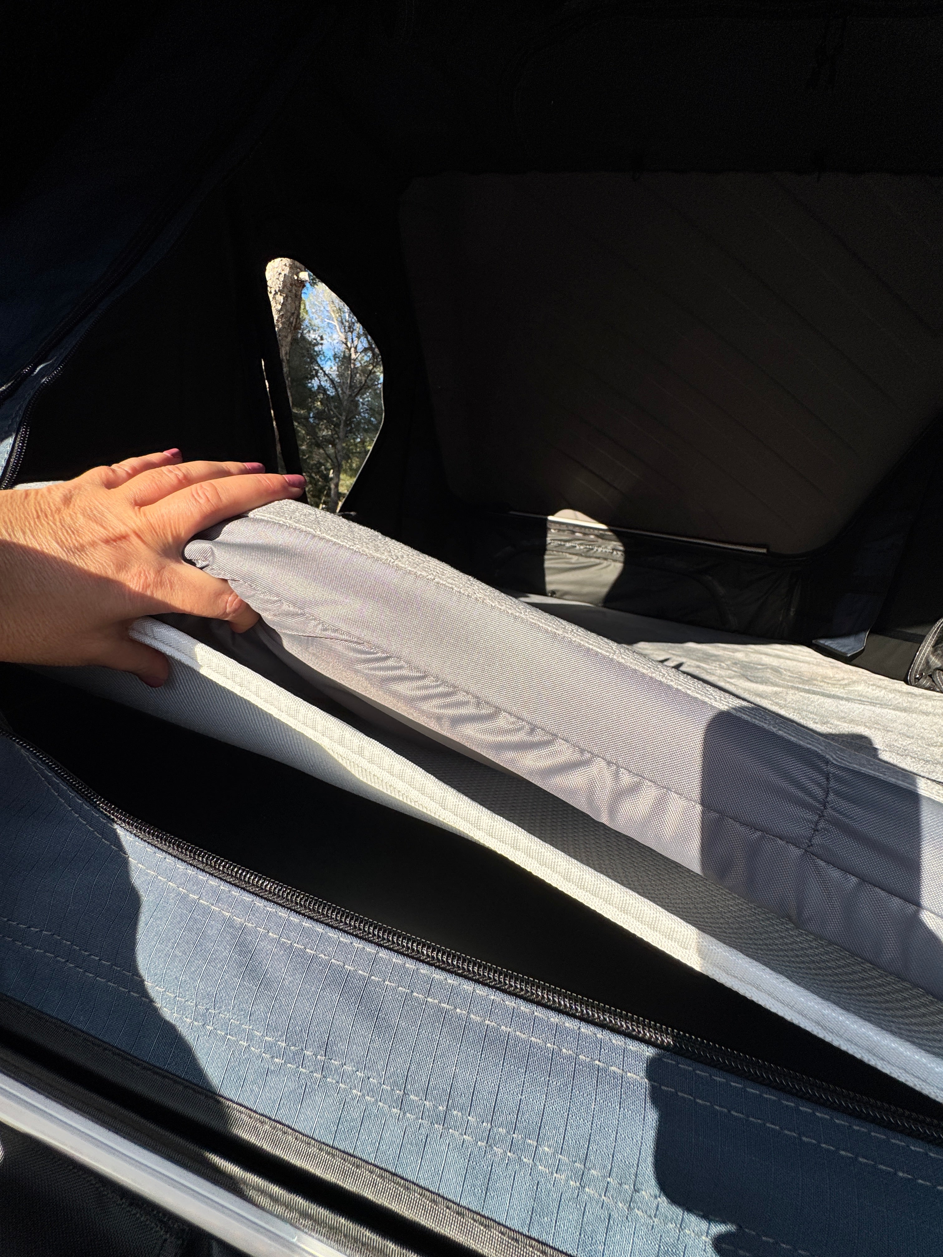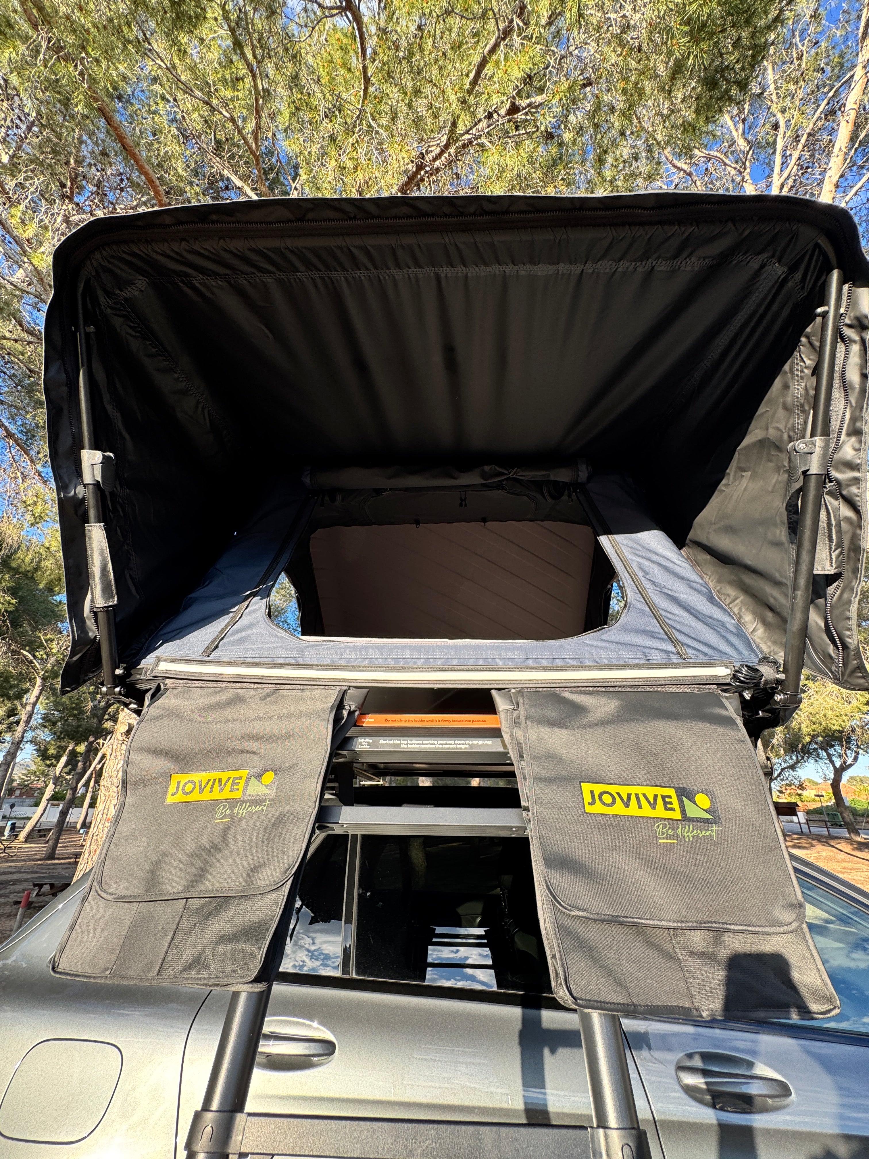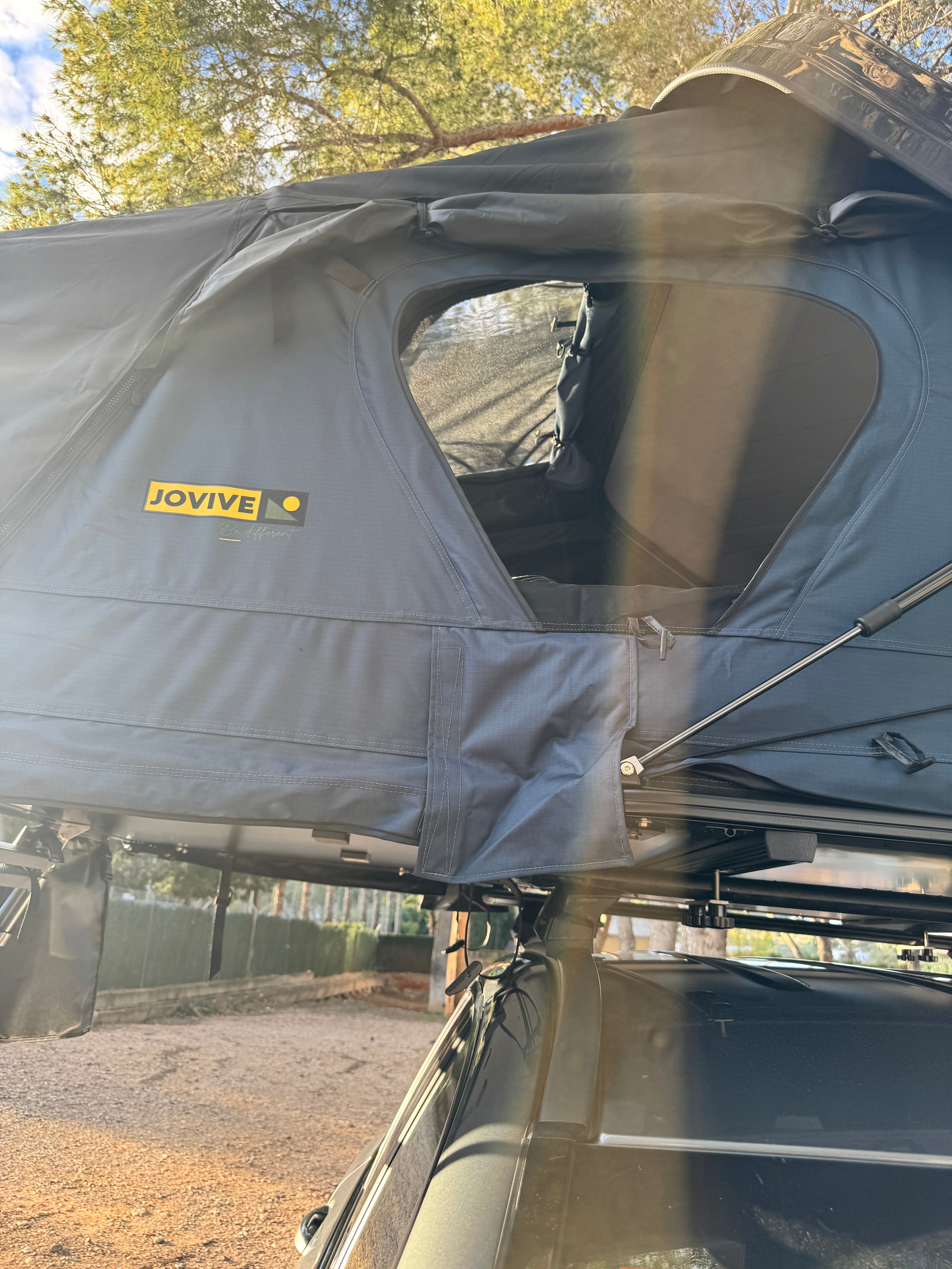 Tente de toit avec toit rigide en aluminium. Cherchant à avoir de l'espace à l'intérieur lorsqu'elle est ouverte et une taille plus petite lorsque la tente est fermée. Avec ses 4 ouvertures latérales et un lanterneau, elle permet une circulation d'air très importante pour les chaudes journées d'été. Et pour les jours froids d'hiver, on peut y ajouter un isolant thermique qui, bien que facile à monter et démonter, est généralement laissé en place en hiver car la tente permet de se fermer avec celui-ci installé.